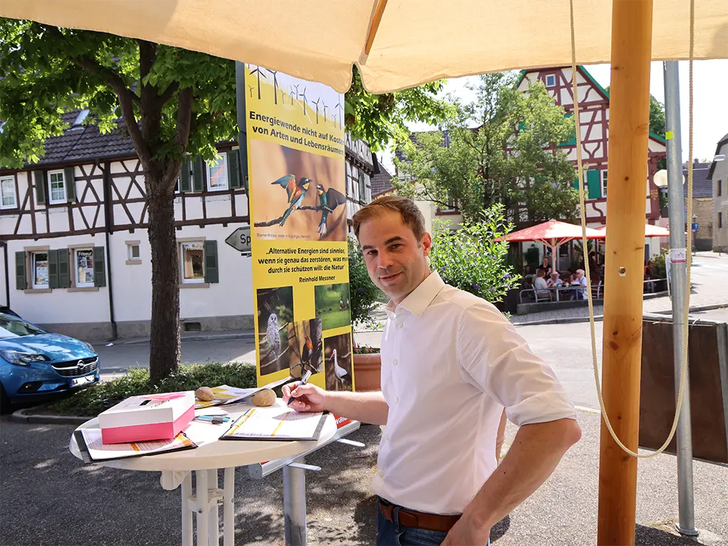 Auch die Bürgerinitiative „Gegenwind Bruchsal“ war vor Ort in Heidelsheim vertreten. Dammert zeigte sich solidarisch mit deren Anliegen gegen den Ausbau von Windkraftanlagen im Stadtgebiet und unterstützte das laufende Bürgerbegehren mit seiner Unterschrift. Er betonte, dass solche Großprojekte mit Augenmaß geplant und die Bürger frühzeitig beteiligt werden müssten.